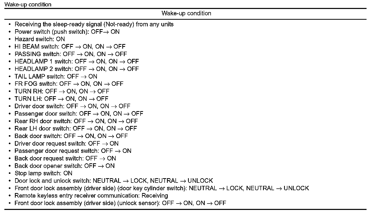 - BCM transmits the sleep wake up signal (sleep) to each unit when all of the CAN sleep conditions are fulfilled.