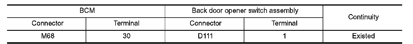 2.Check continuity between BCM harness connector and back door opener switch assembly harness connector.