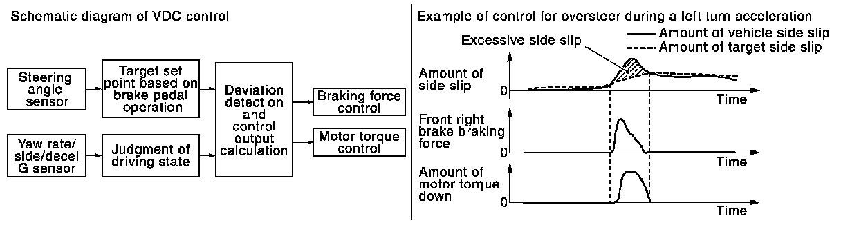 - In addition to ABS function, EBD function and TCS function, target side slip amount is calculated according to steering operation amount from steering angle sensor. By comparing this information with vehicle side slip amount that is calculated from information from yaw rate/side/decel G sensor and wheel sensor, vehicle driving conditions (conditions of understeer or oversteer) are judged and vehicle stability is improved by brake force control on all 4 wheels and motor torque control.