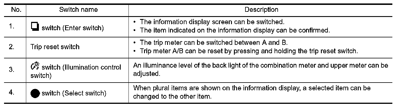- The meter control switch can be used to control the combination meter functions listed below and to change the display of vehicle information.