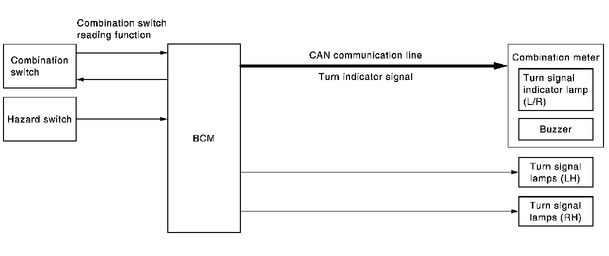 - BCM transmits the turn signal indicator lamp signal to the combination meter using CAN communication while the turn signal lamp and the hazard warning lamp are operating.