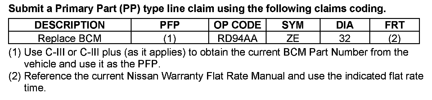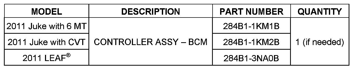 1. Replace the BCM with the one that applies in PARTS INFORMATION (see below).