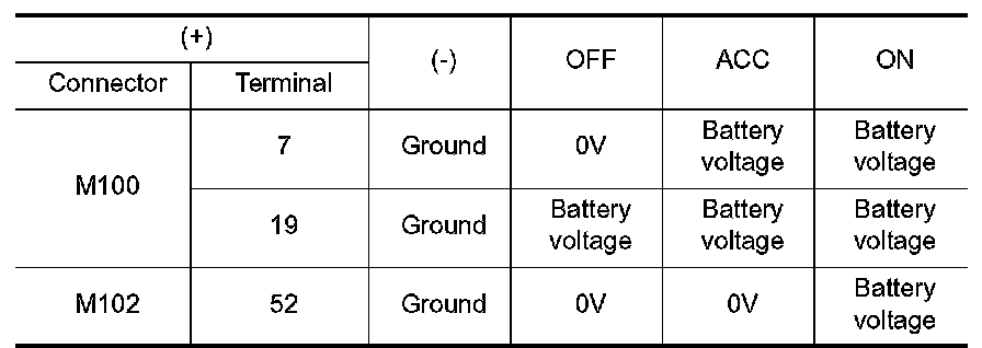 2.Check voltage between the AV control unit connectors M100 and M102 and ground.