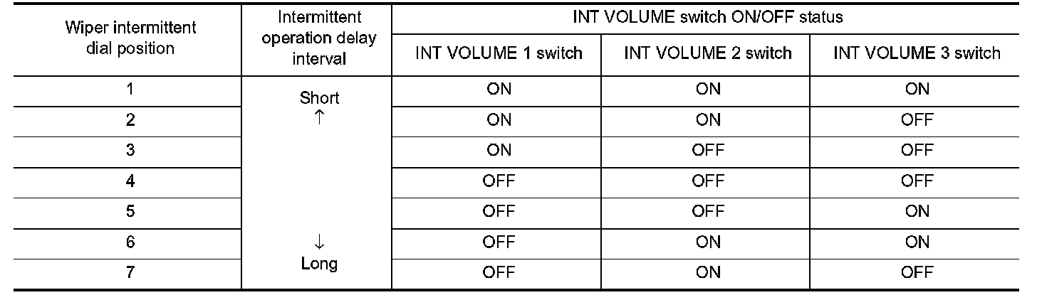 BCM judges the wiper intermittent dial 1 - 7 by the status of INT VOLUME 1, 2, and 3 switches.