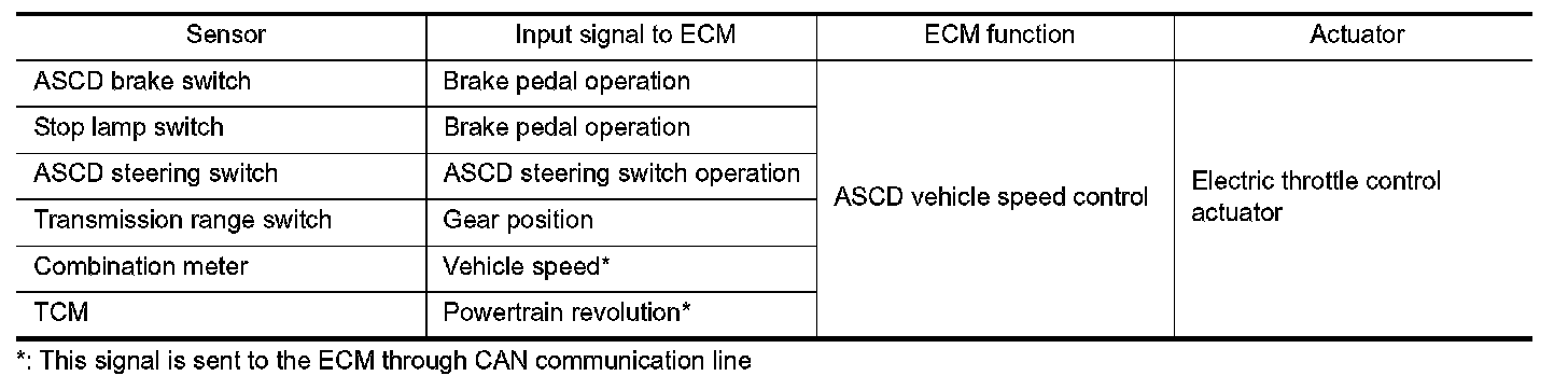 The ASCD operation status is indicated by two indicators (CRUISE and SET on the information display) on the combination meter. If any malfunction occurs in ASCD system, SET indicator blinks and ASCD control is deactivated.