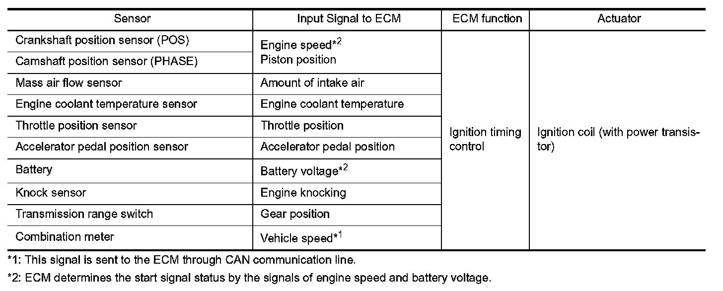 The ECM receives information such as the injection pulse width and camshaft position sensor (PHASE) signal. Computing this information, ignition signals are transmitted to the power transistor.