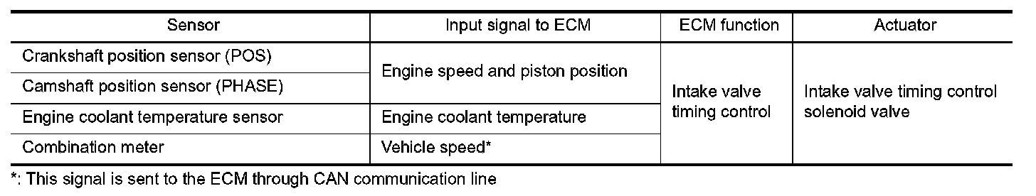 The ECM receives signals such as crankshaft position, camshaft position, engine speed, and engine coolant temperature. Then, the ECM sends ON/OFF pulse duty signals to the intake valve timing (IVT) control solenoid valve depending on driving status. This makes it possible to control the shut/open timing of the intake valve to increase engine torque in low/mid speed range and output in high-speed range.