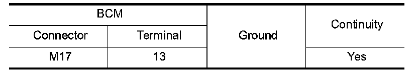 Check continuity between BCM harness connector and ground.