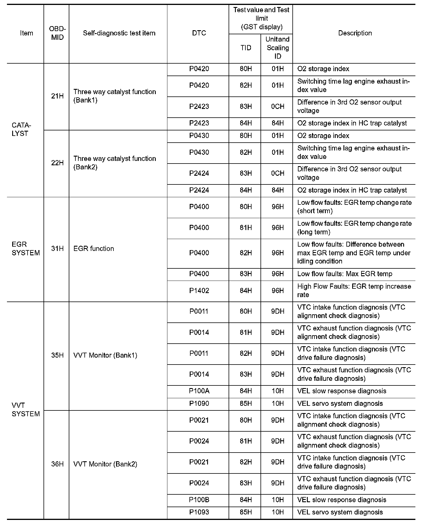 The items of the test value and test limit will be displayed with GST screen which items are provided by the ECM. (e.g., if bank 2 is not applied on this vehicle, only the items of bank 1 are displayed)