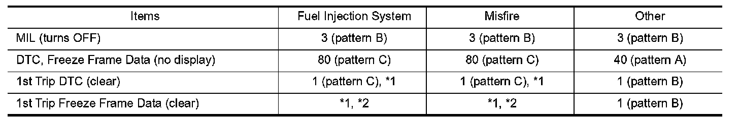 - The DTC and the freeze frame data will be stored until the vehicle is driven 40 times (driving pattern A) without the same malfunction recurring (except for Misfire and Fuel Injection System). For Misfire and Fuel Injection System, the DTC and freeze frame data will be stored until the vehicle is driven 80 times (driving pattern