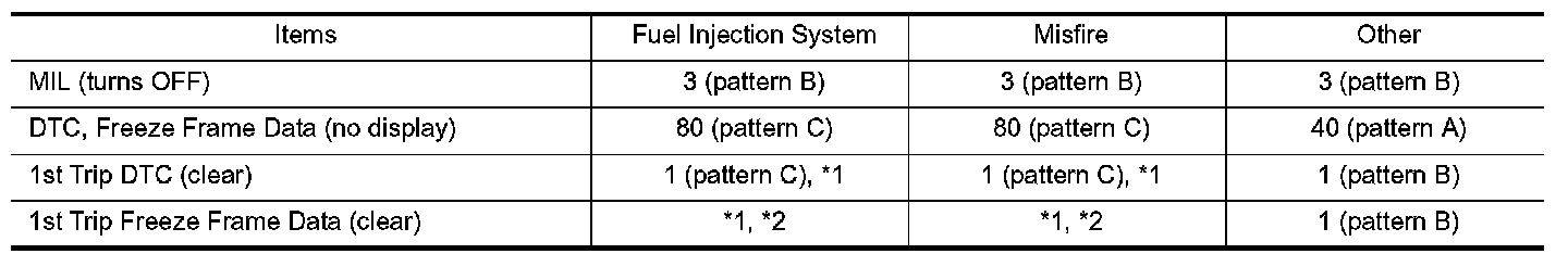 - The DTC and the freeze frame data will be stored until the vehicle is driven 40 times (driving pattern A) without the same malfunction recurring (except for Misfire and Fuel Injection System). For Misfire and Fuel Injection System, the DTC and freeze frame data will be stored until the vehicle is driven 80 times (driving pattern