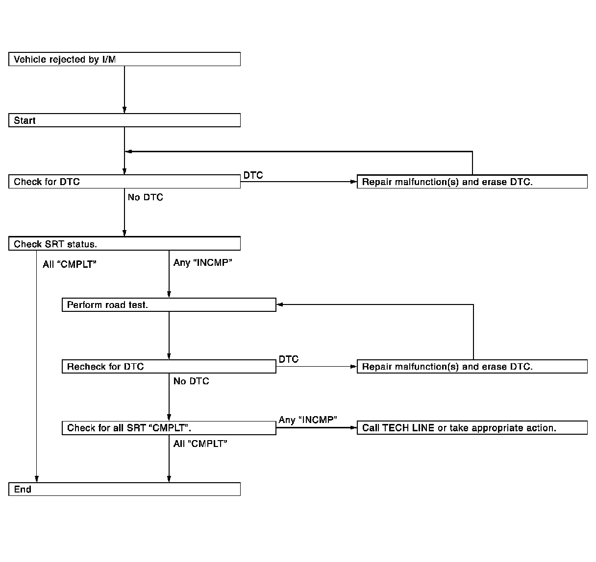 If a vehicle has failed the state emissions inspection due to one or more SRT items indicating "INCMP", review the flowchart diagnostic sequence, referring to the following flowchart.