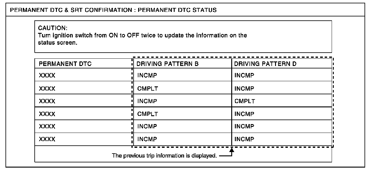 Since the "PERMANENT DTC STATUS" screen displays the previous trip information, repeat the following twice to update the information: "Ignition switch OFF", "Wait for more than 10 seconds" and "Ignition switch ON".