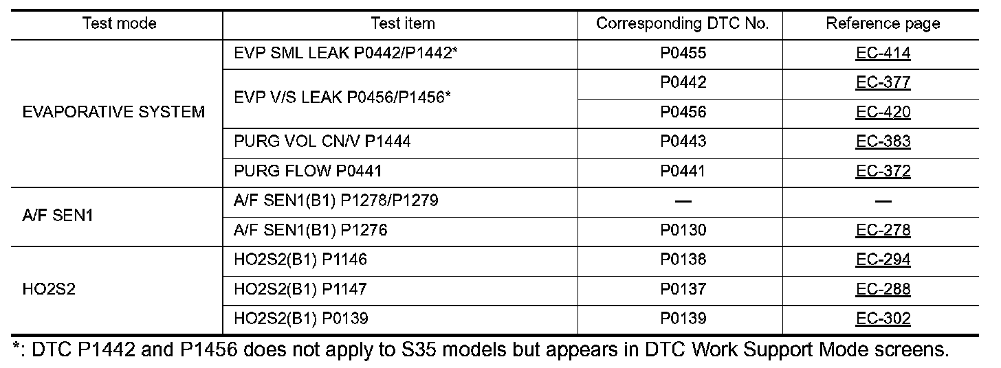 *: DTC P1442 and P1456 does not apply to S35 models but appears in DTC Work Support Mode screens.