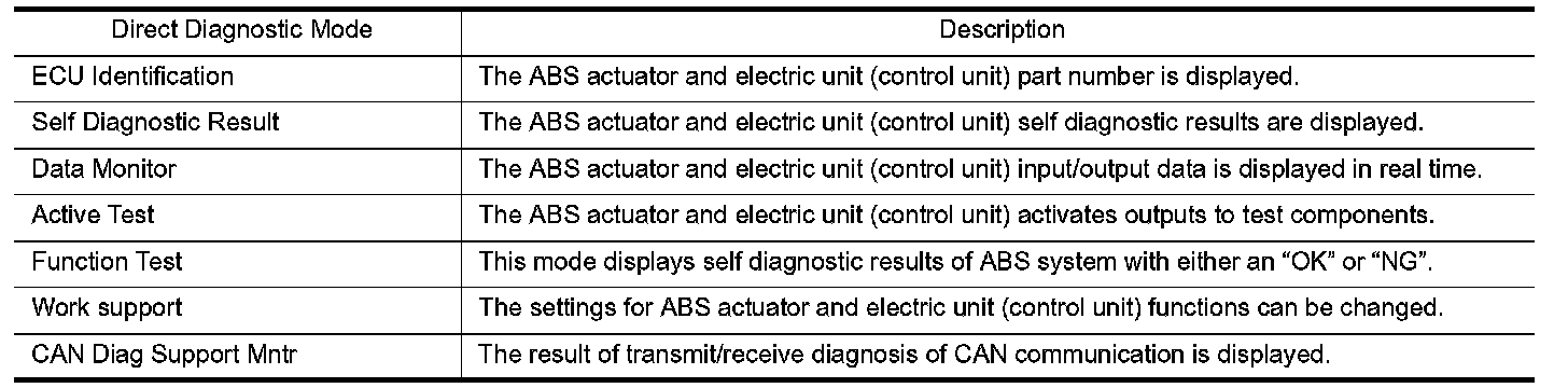 CONSULT can display each diagnostic item using the following direct diagnostic modes.