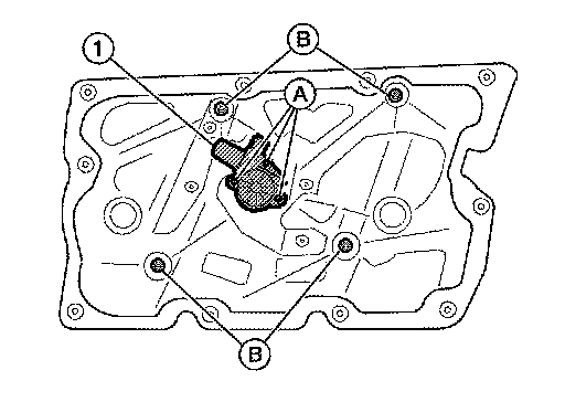 Remove the window motor nuts (A) the four window regulator bolts (B) and the window motor (1) from the door module assembly. On the back side remove the window regulator from the door module assembly.