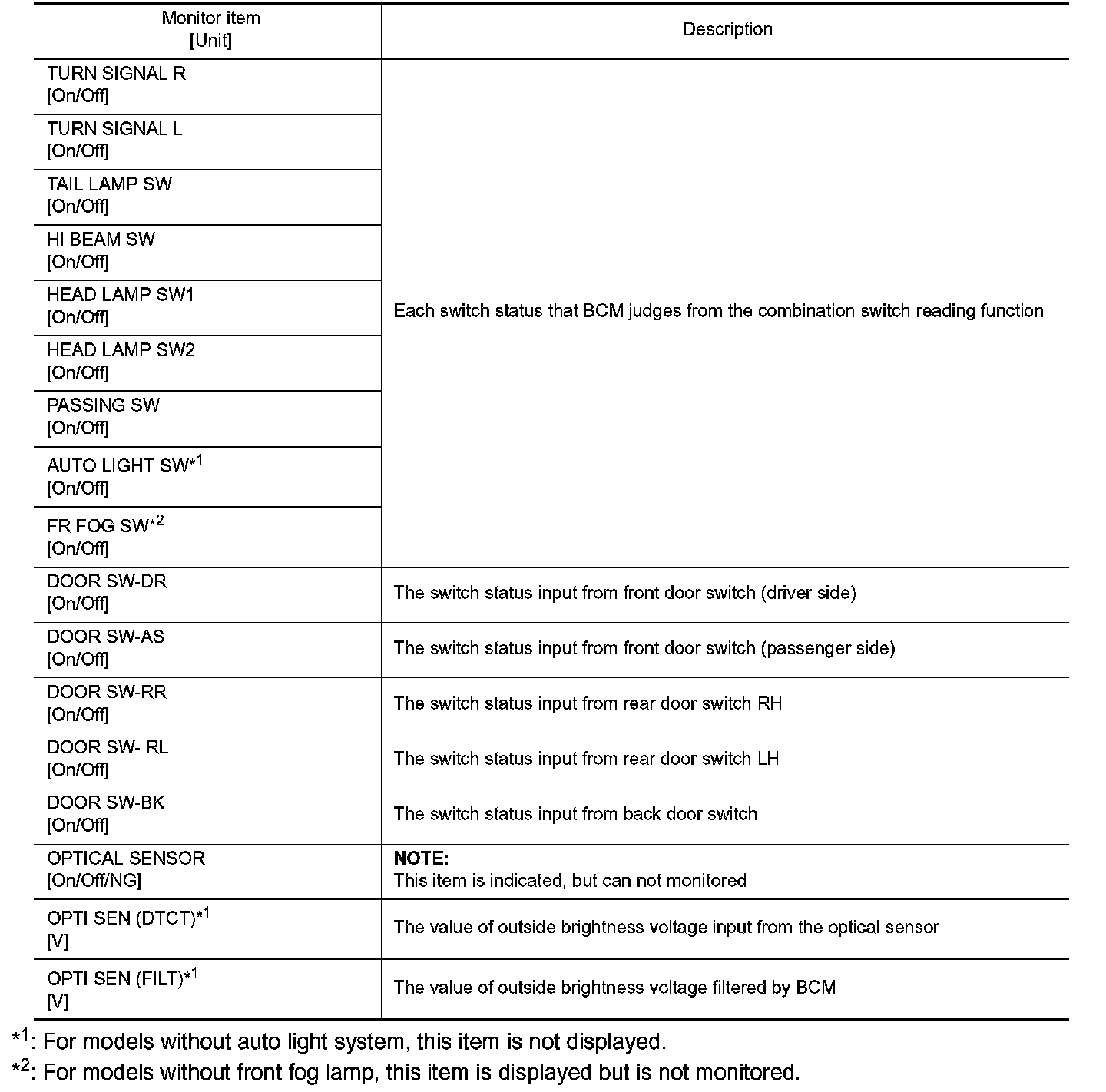 *: For models without front fog lamp, this item is displayed but is not monitored.