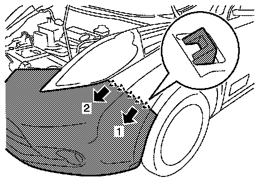 9.Pull bumper fascia assembly side toward the vehicle outside as shown by the arrows in the figure, and then disengage bumper fascia assembly from bumper side brackets (LH and RH).
