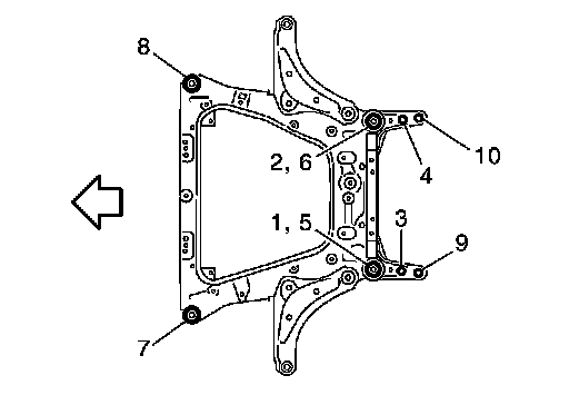 - To install member stay and mounting bolts of front suspension member, temporarily tighten the bolts before tightening to the specified torque, referring to the tightening method and the numerical order shown below: