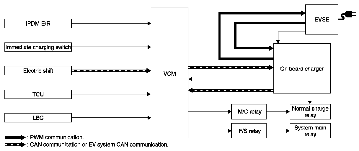 When EVSE is connected under the power switch OFF condition, VCM judges that the system is in a charge mode and activates the F/S relay and M/C relay to allow charging operation.
