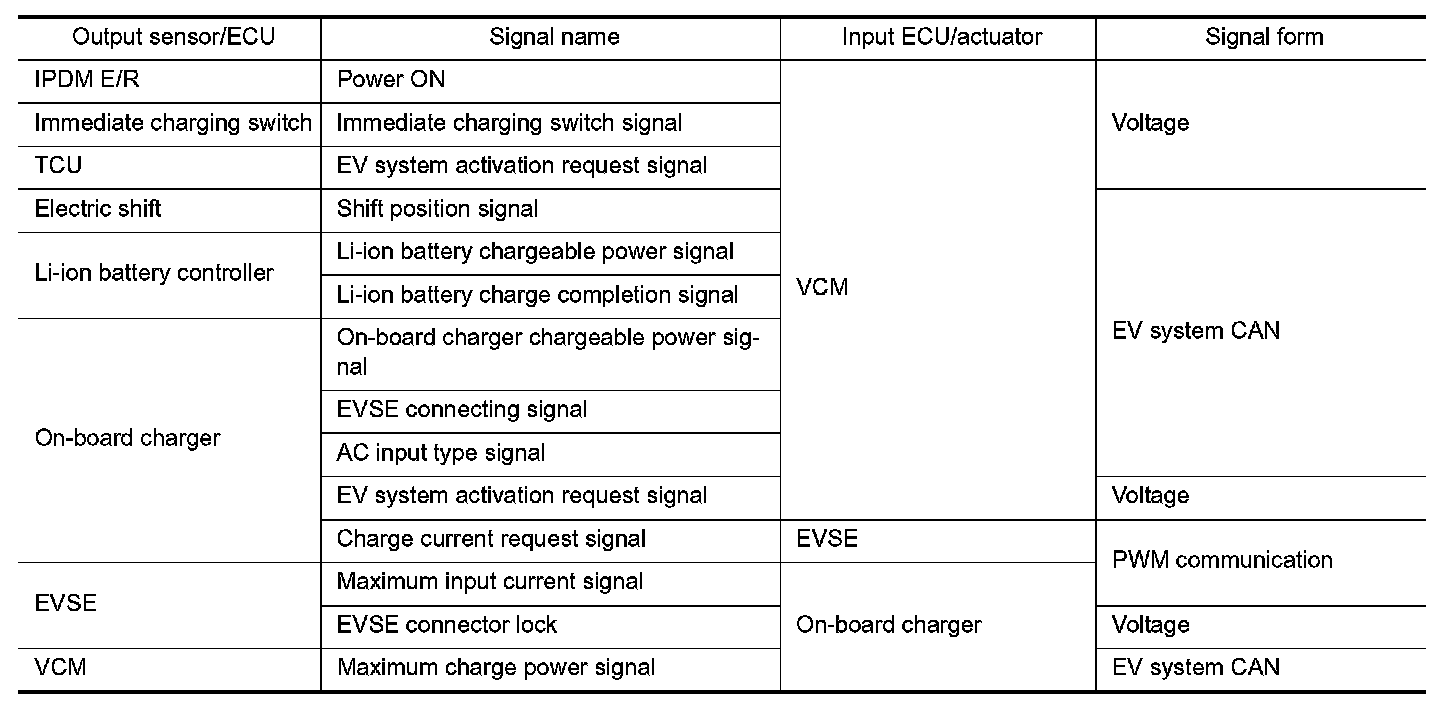 When EVSE is connected to the normal charge port, the on-board charger transmits an EV system activation signal to VCM. Li-ion battery charge then starts immediately.