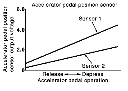 The accelerator pedal sensor is integrated with the accelerator pedal. This sensor is a potentiometer that detects the acceleration pedal stroke, converts it to a voltage signal, and transmits the signal to VCM. The sensor transmits its signals through dual lines, providing a minimum driving function even if either line malfunctions.