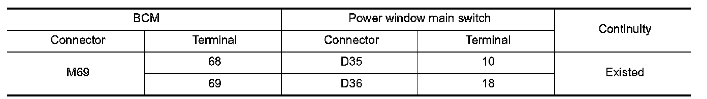 2.Check continuity between BCM harness connector and power window main switch harness connector.
