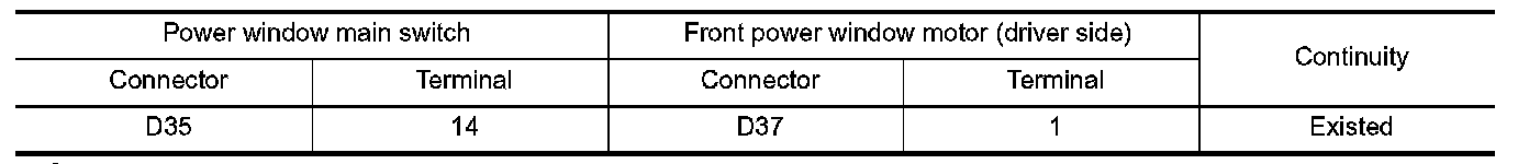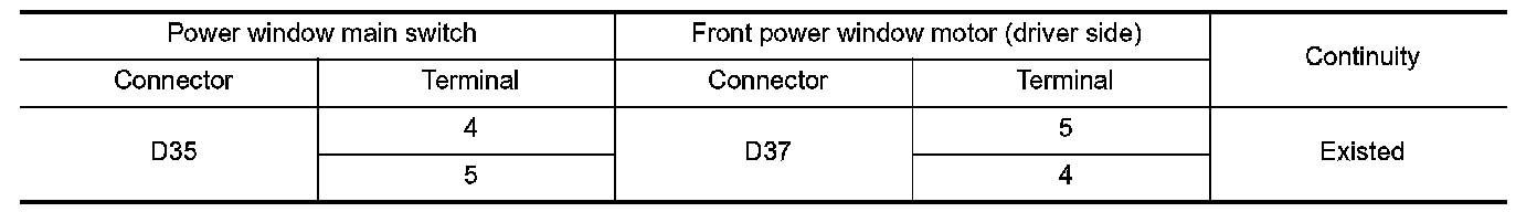 2.Check continuity between power window main switch harness connector and front power window motor (driver side) harness connector.