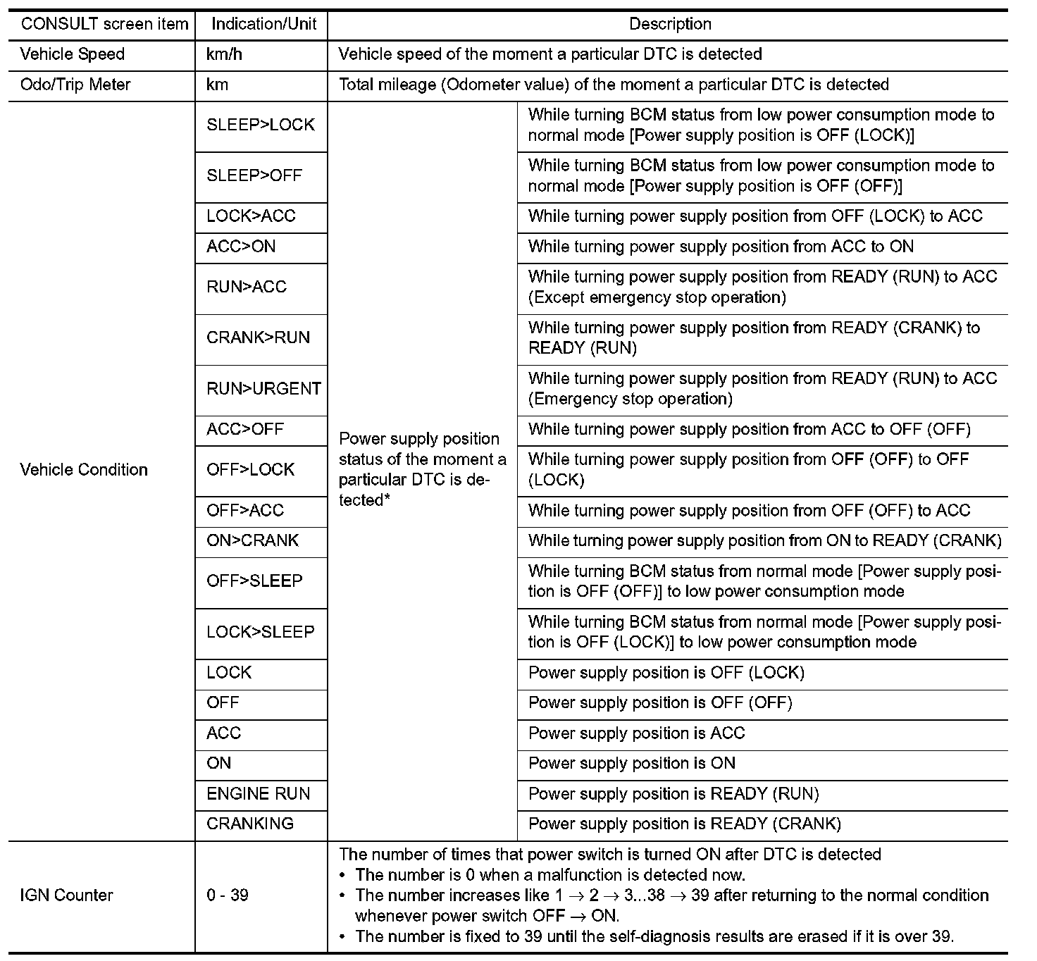 The BCM records the following vehicle condition at the time a particular DTC is detected, and displays on