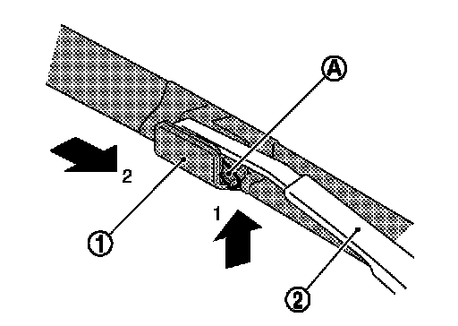 1.Push up the lever (A) of wiper blade (1), while sliding wiper blade toward the direction of the arrow, to remove it from wiper arm (2).