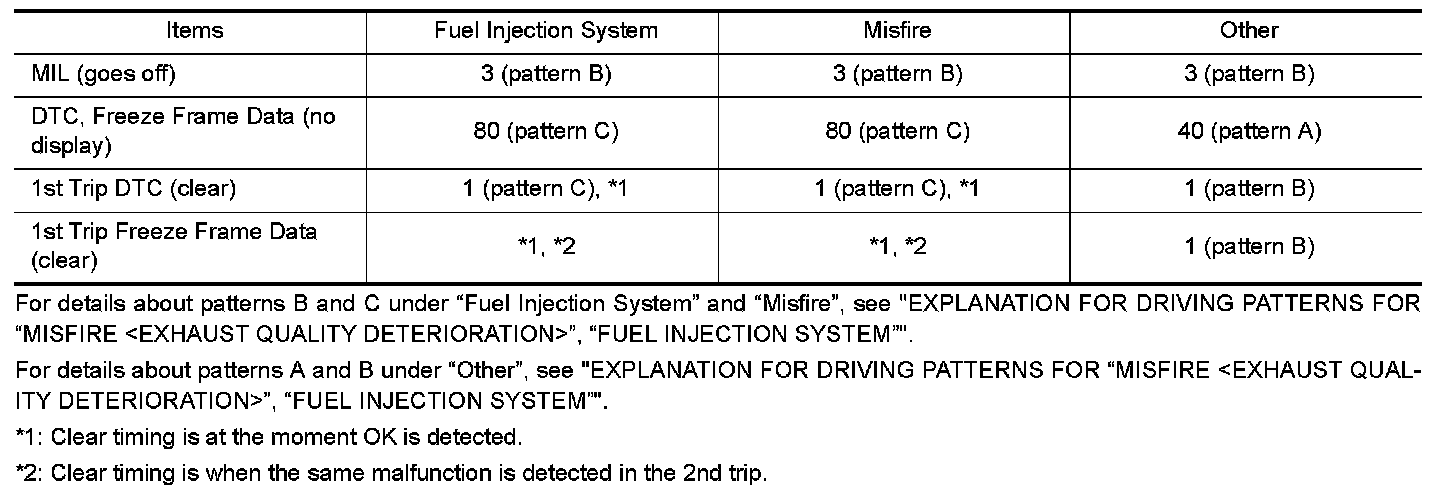 - The DTC and the freeze frame data will be stored until the vehicle is driven 40 times (driving pattern A) without the same malfunction recurring (except for Misfire and Fuel Injection System). For Misfire and Fuel Injection System, the DTC and freeze frame data will be stored until the vehicle is driven 80 times (driving pattern