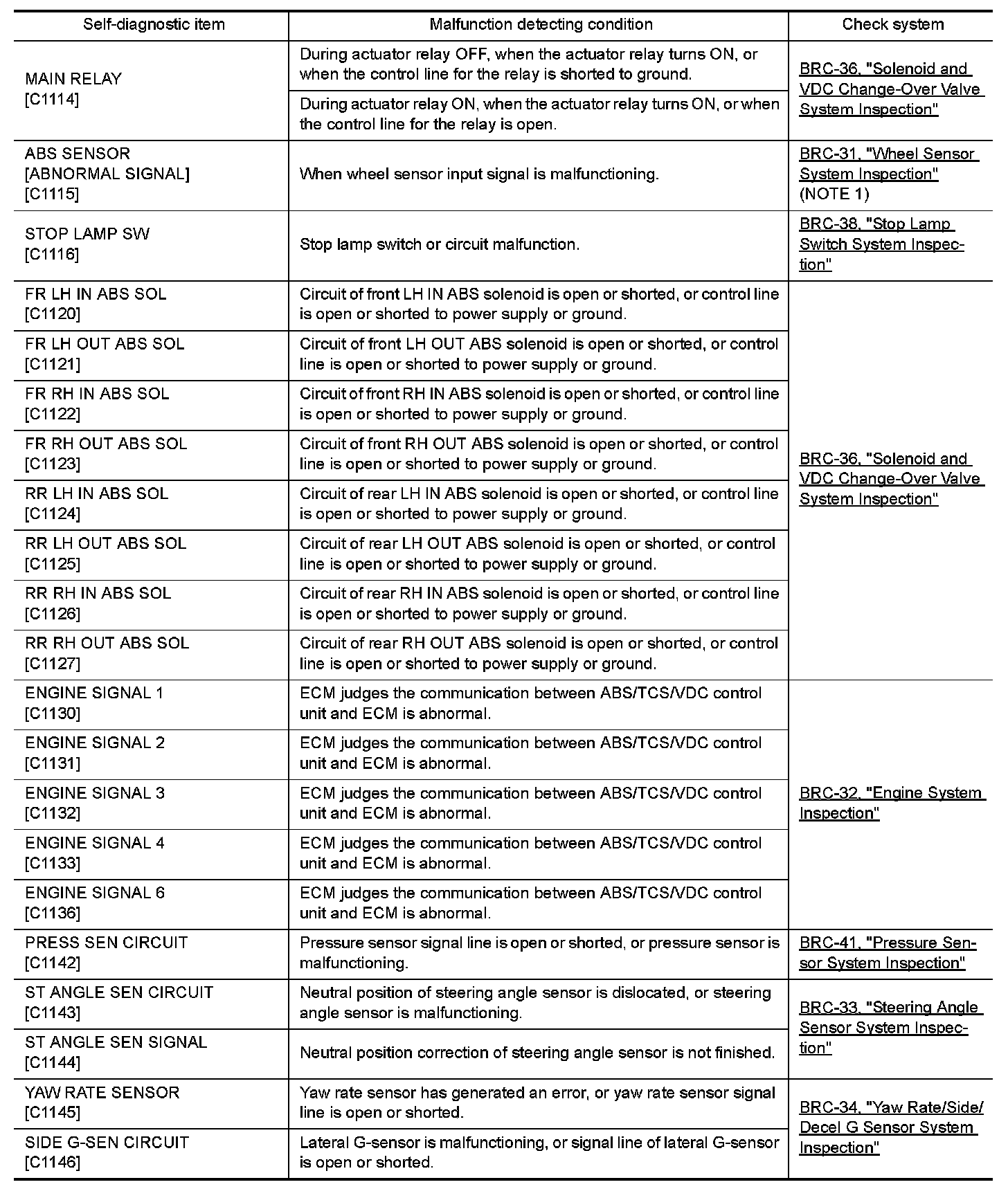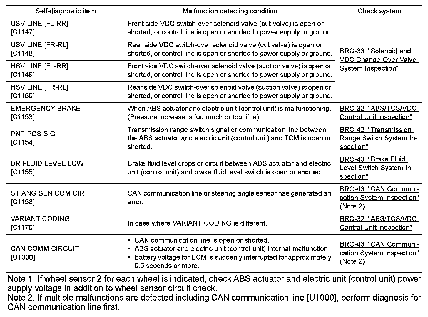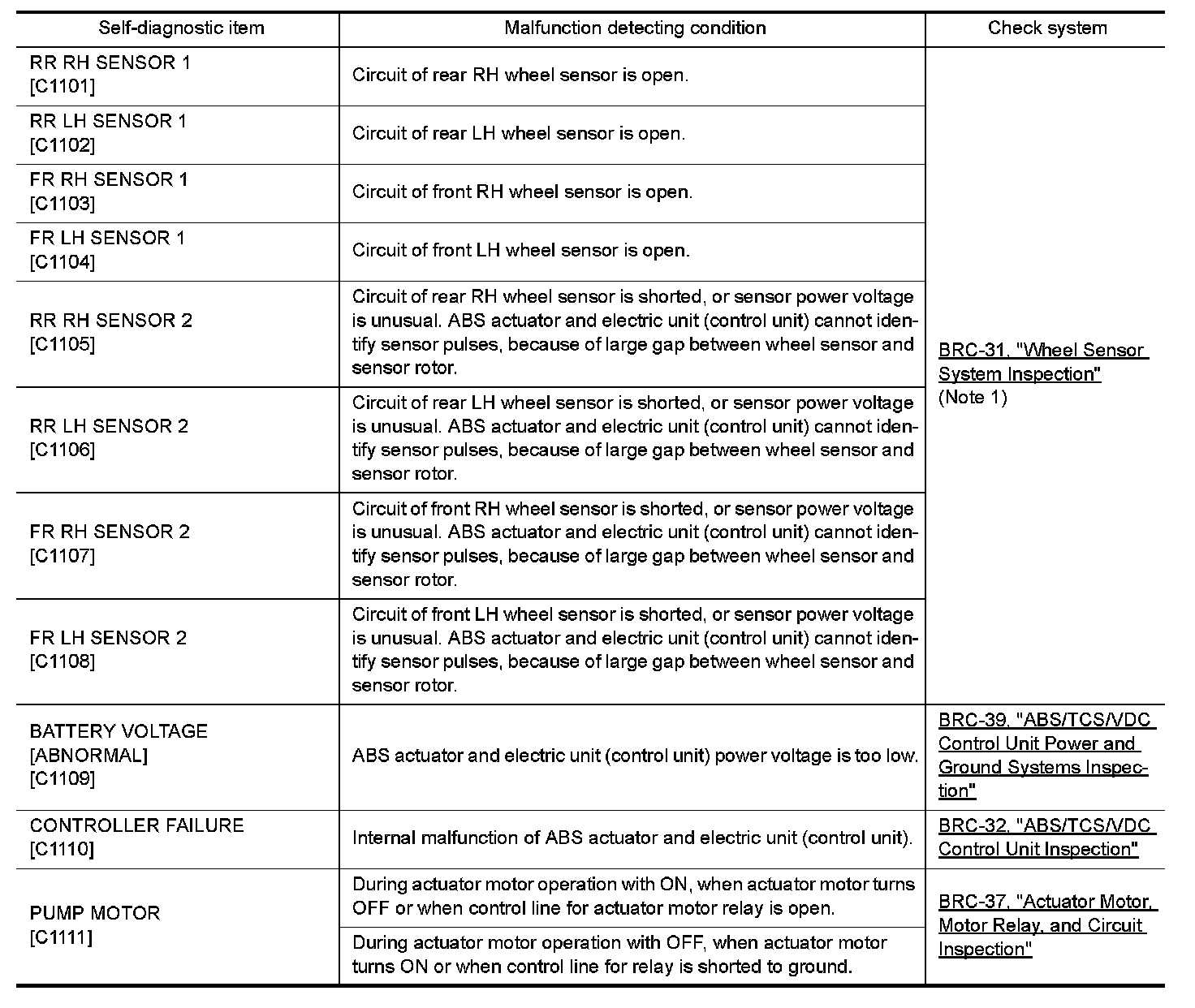Note 1. If wheel sensor 2 for each wheel is indicated, check ABS actuator and electric unit (control unit) power supply voltage in addition to wheel sensor circuit check.