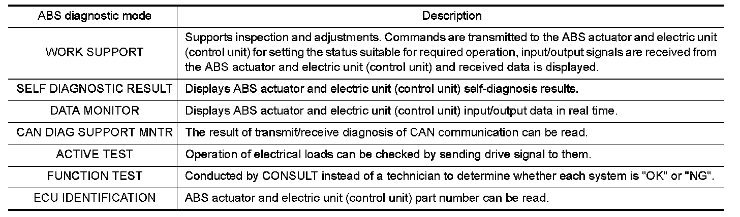 CONSULT can display each diagnostic item using the diagnostic test modes shown following.