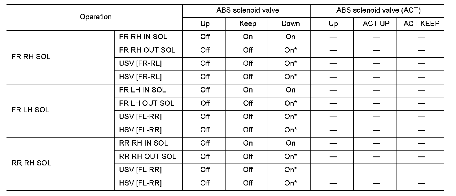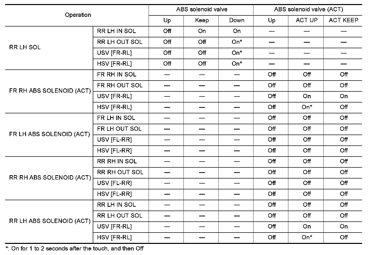 - For ABS solenoid valve, touch "Up", "Keep", and "Down" on the display screen. For ABS solenoid valve (ACT), touch "Up", "ACT UP", "ACT KEEP" and confirm that solenoid valves operate as shown in the table below.