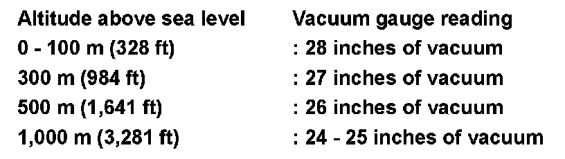 8.Continue to draw the vacuum until the gauge reaches 28 inches of vacuum. The gauge may not reach 28 inches in high altitude locations, use the vacuum specifications below based on the altitude above sea level.