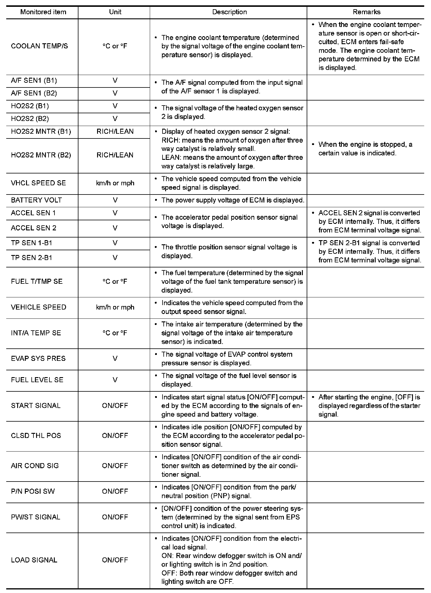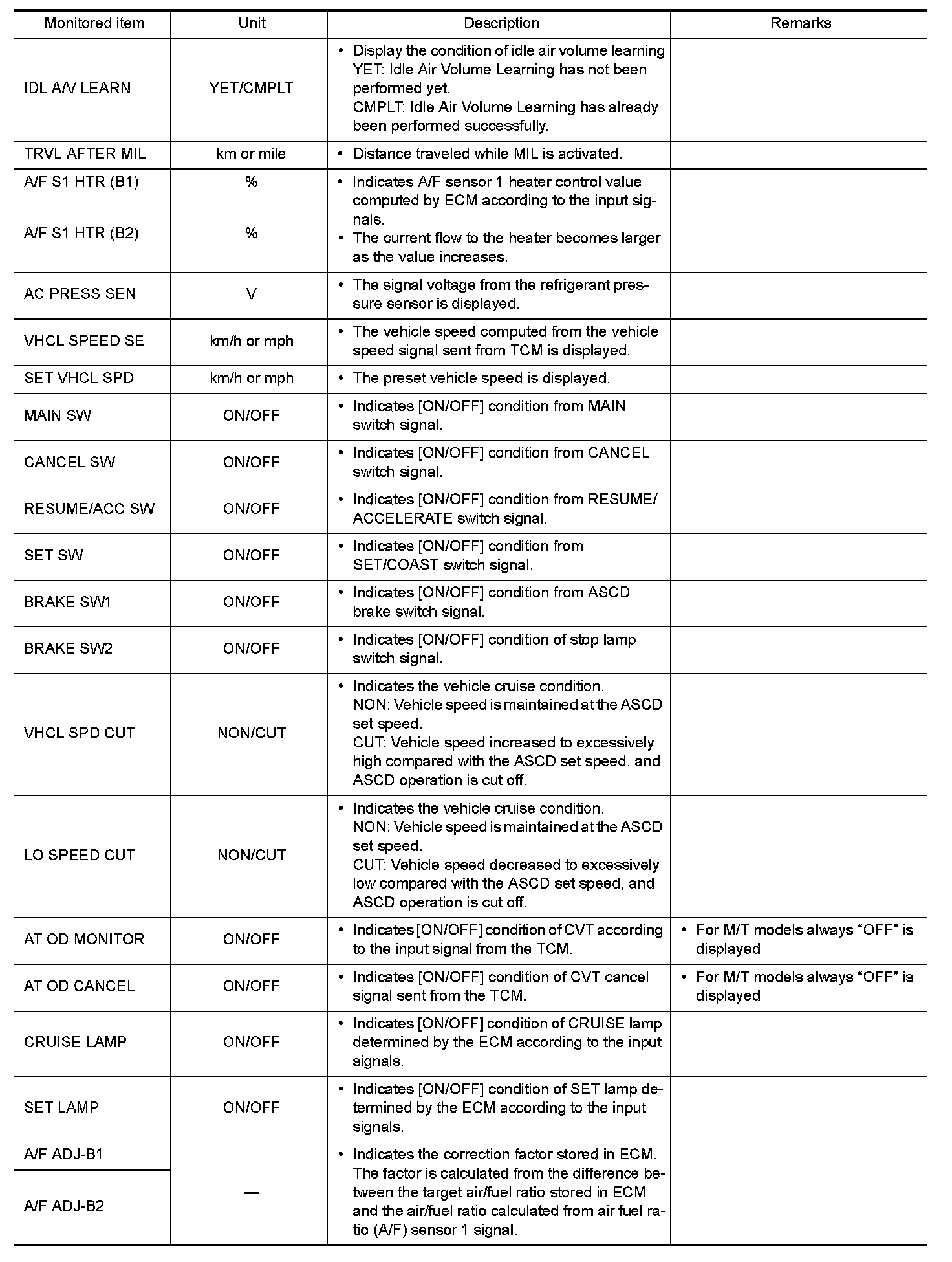 Any monitored item that does not match the vehicle being diagnosed is deleted from the display automatically.