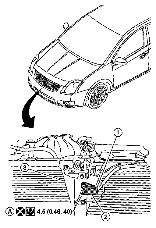 4.Remove crash zone sensor nuts (A), then remove the crash zone sensor (2) from the radiator core support (3).
