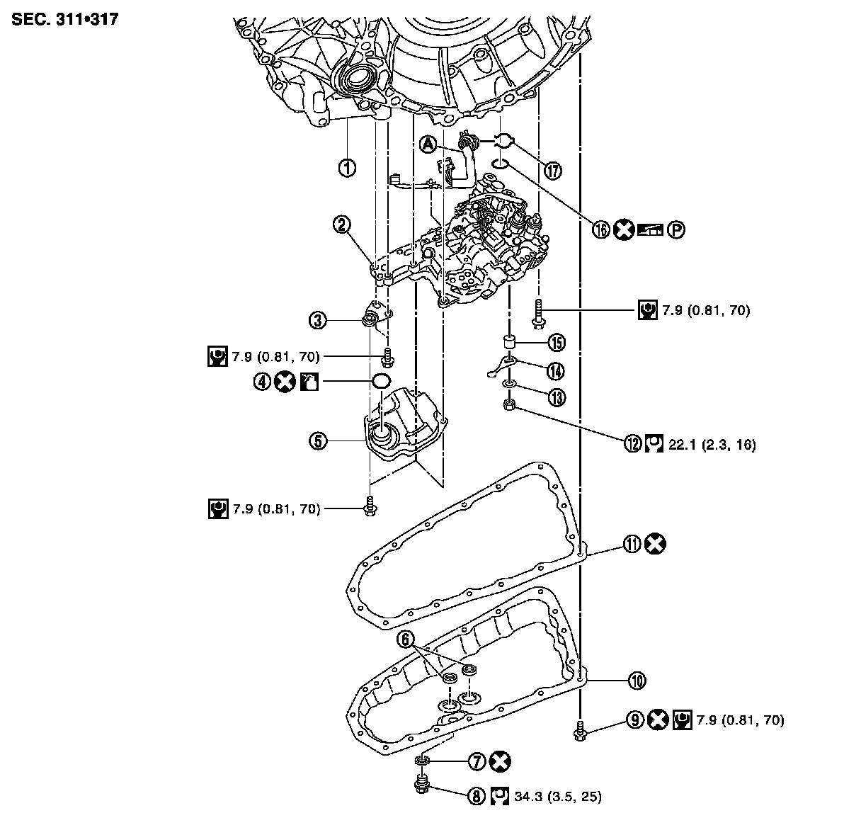 d.Tighten the oil pan bolts again clockwise from (1) shown to the specified torque.