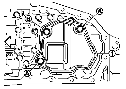 12.Remove the oil strainer assembly bolts (A) and (B), and then remove the oil strainer assembly (1).