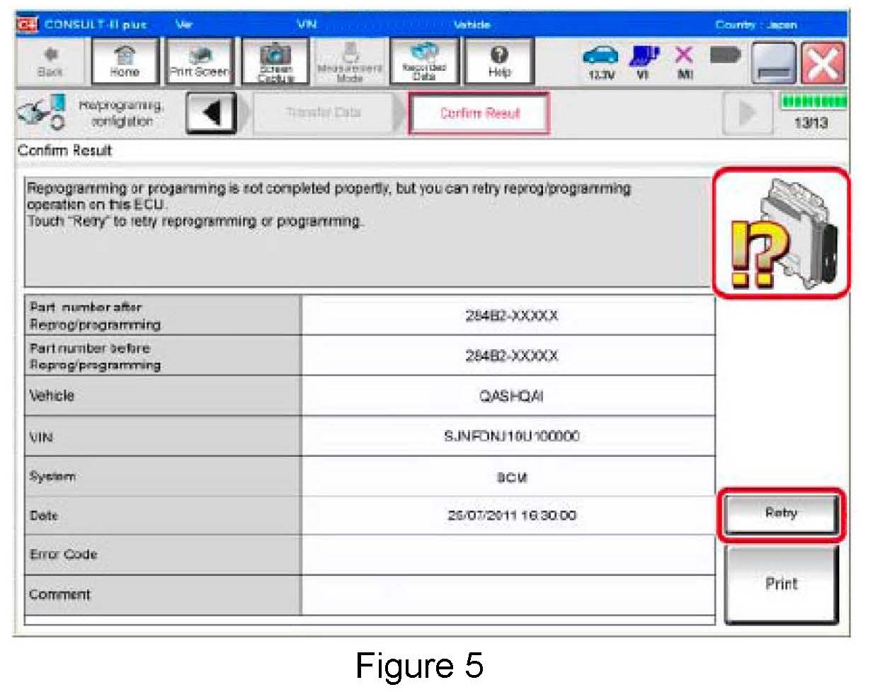 If reprogramming does not complete and the "!?" icon displays as shown in Figure 5: