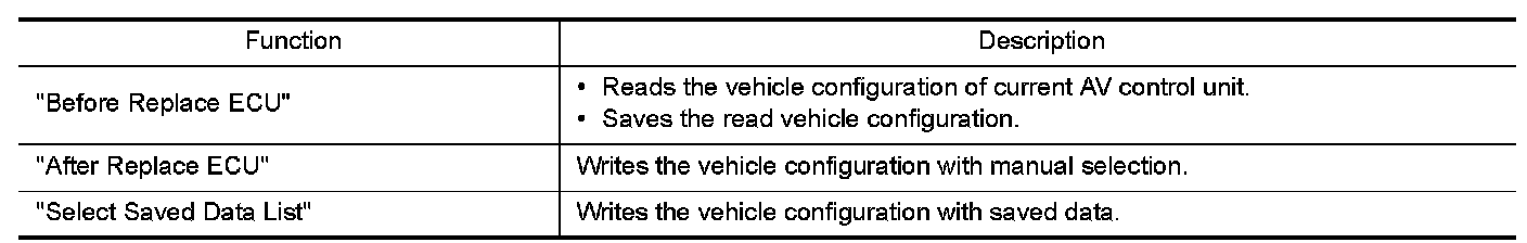 - Never perform "Select Saved Data List" or "After Replace ECU" except for new AV control unit.
