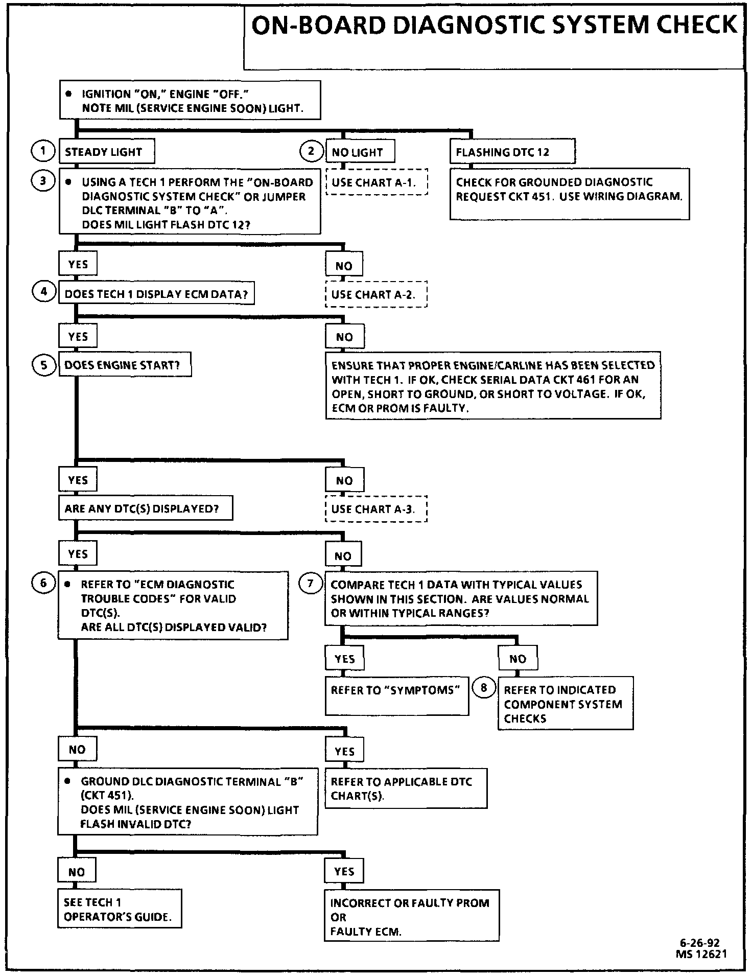 The on-board diagnostic system check is an organized approach to identifying a problem created by an electronic engine control system malfunction. It must be the starting point for any driveability complaint diagnosis, because it directs the service technician to the next logical step in diagnosing the complaint. Understanding the chart and using it correctly will reduce diagnostic time and prevent the unnecessary replacement of good parts.