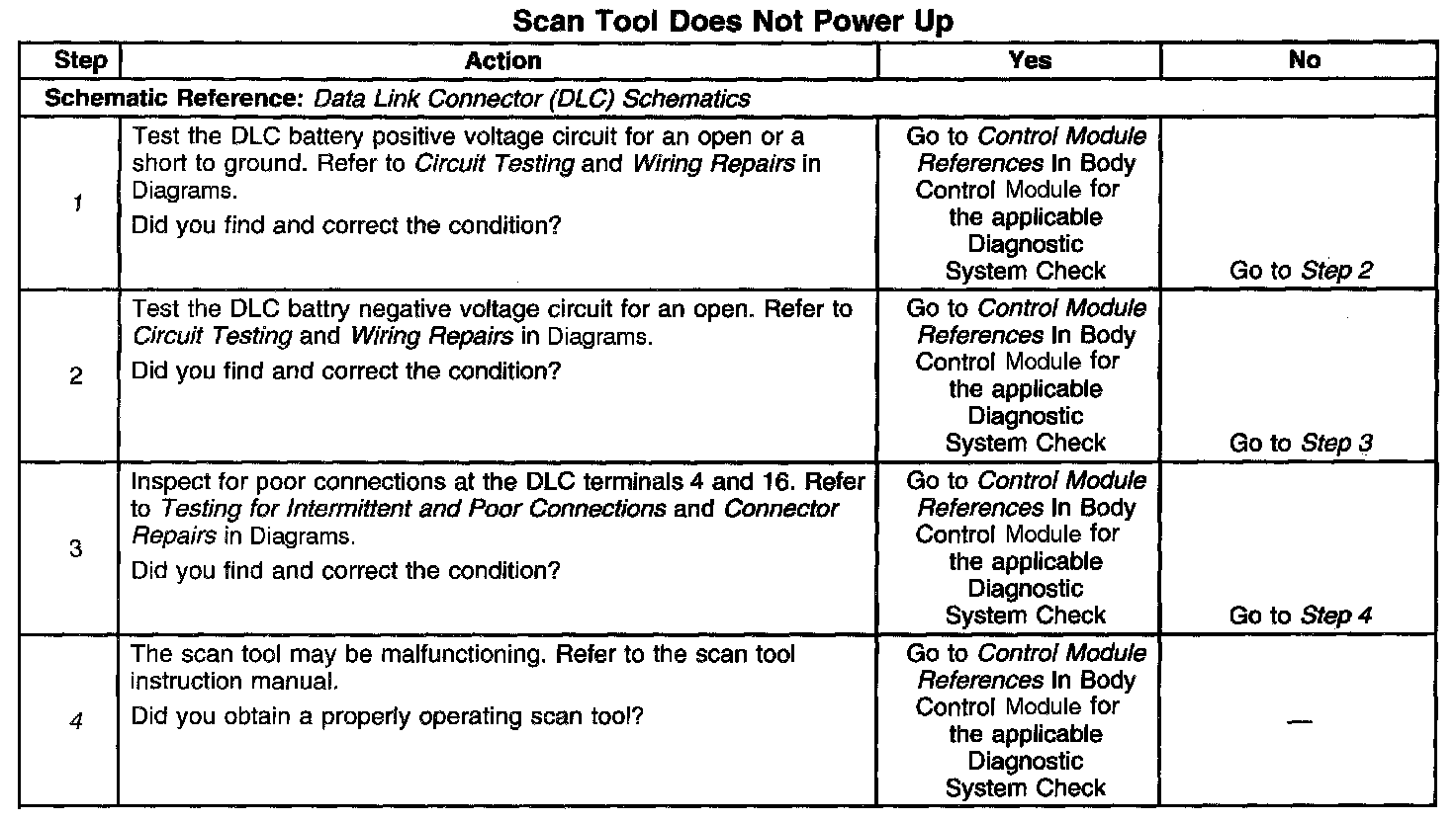 CIRCUIT DESCRIPTIONThe DLC provides battery positive voltage for the scan tool at terminal 16 and battery negative voltage at terminal 4. The DLC provides the class 2 signal at terminal 2 and signal ground at terminal 5. The scan tool will power up with the ignition OFF.