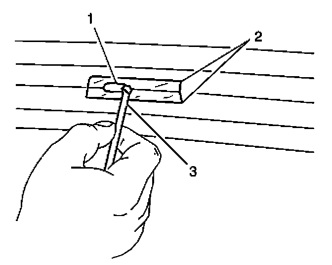 2. Use the brush (3) in order to spread the grid line repair material (1). Ensure that the repair material covers all of the areas of the cut out.
