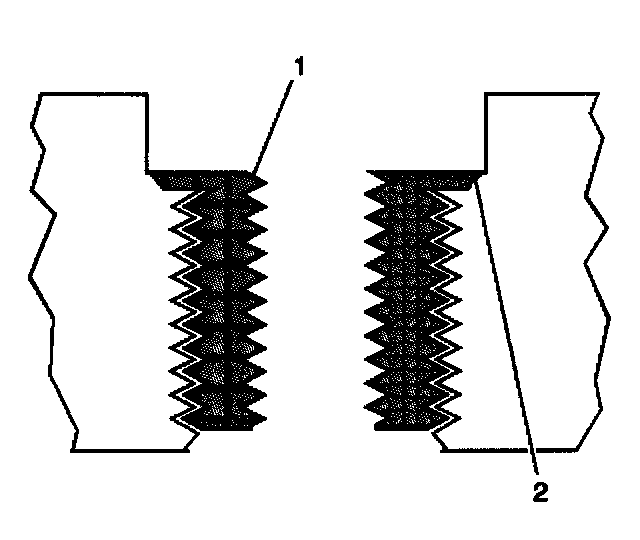 10. Apply threadlock sealant GM P/N United States 12345493, GM P/N Canada 10953483, J 42385-109, LOCTITE 277 or equivalent (1) to the insert OD threads (2).