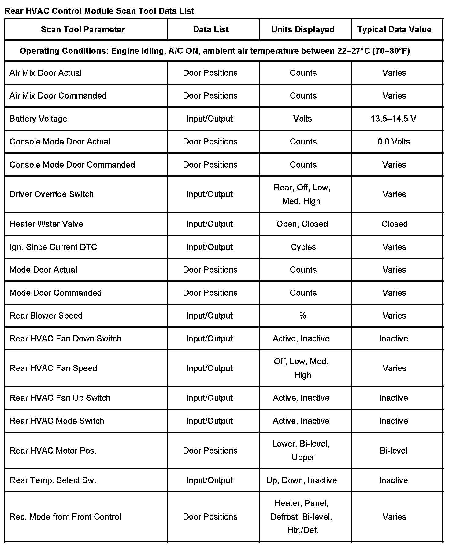 Rear HVAC Control Module Scan Tool Data List: