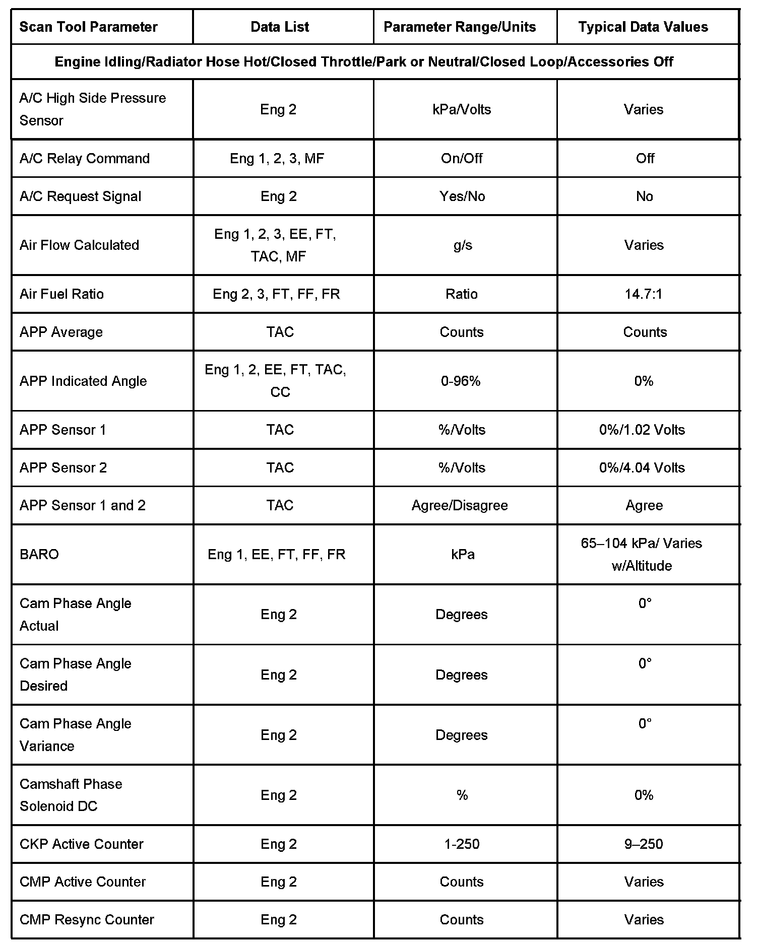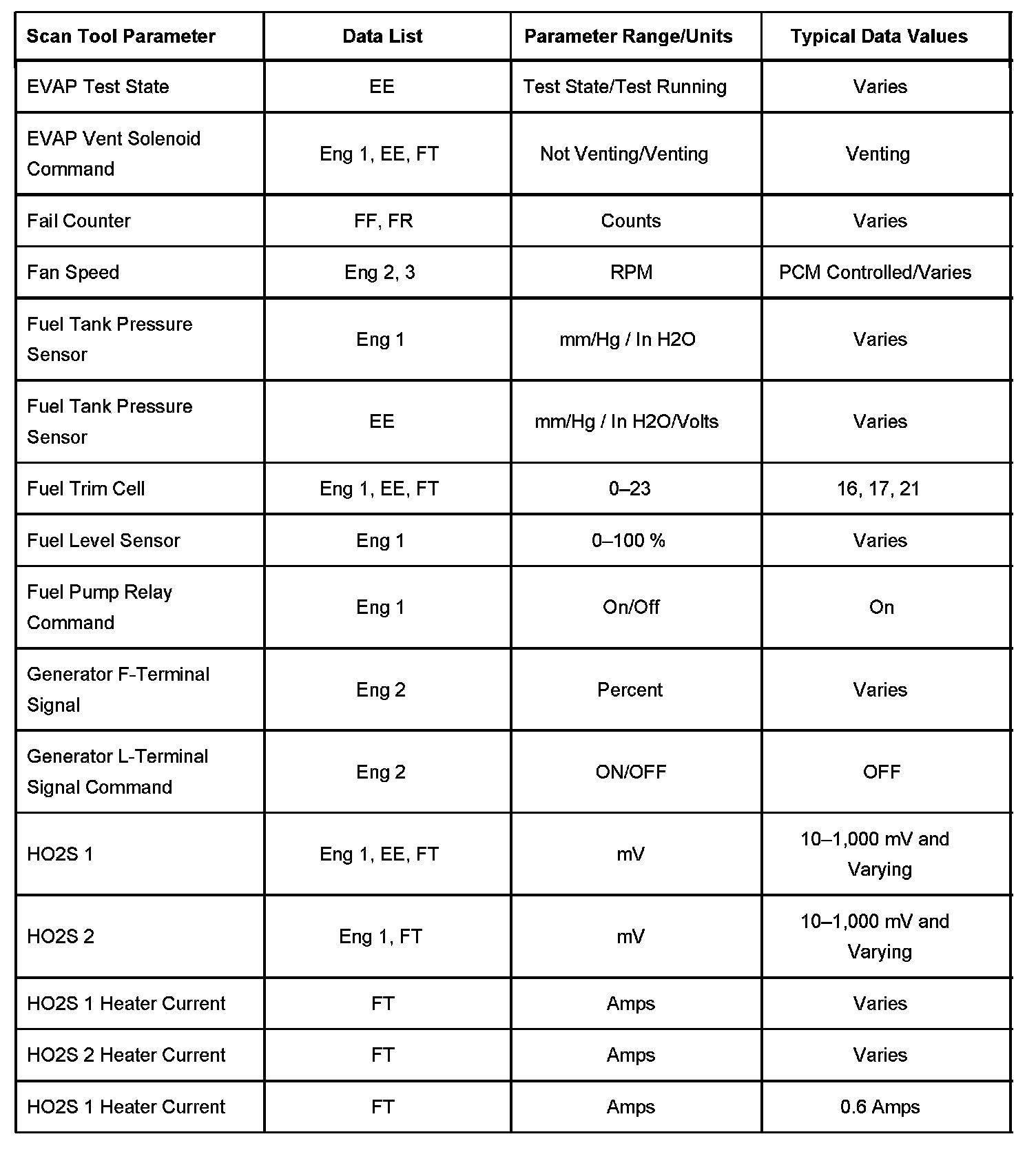 The Engine Scan Tool Data List contains all engine related parameters that are available on the scan tool. The list is arranged in alphabetical order. A given parameter may appear in any one of the data lists, and in some cases may appear more than once, or in more than one data list in order to group certain related parameters together.