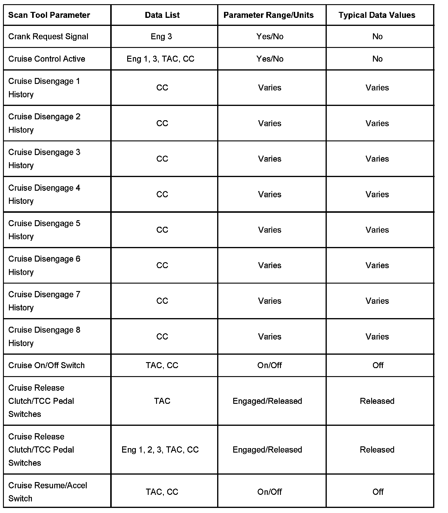 CC - Cruise Control Data List