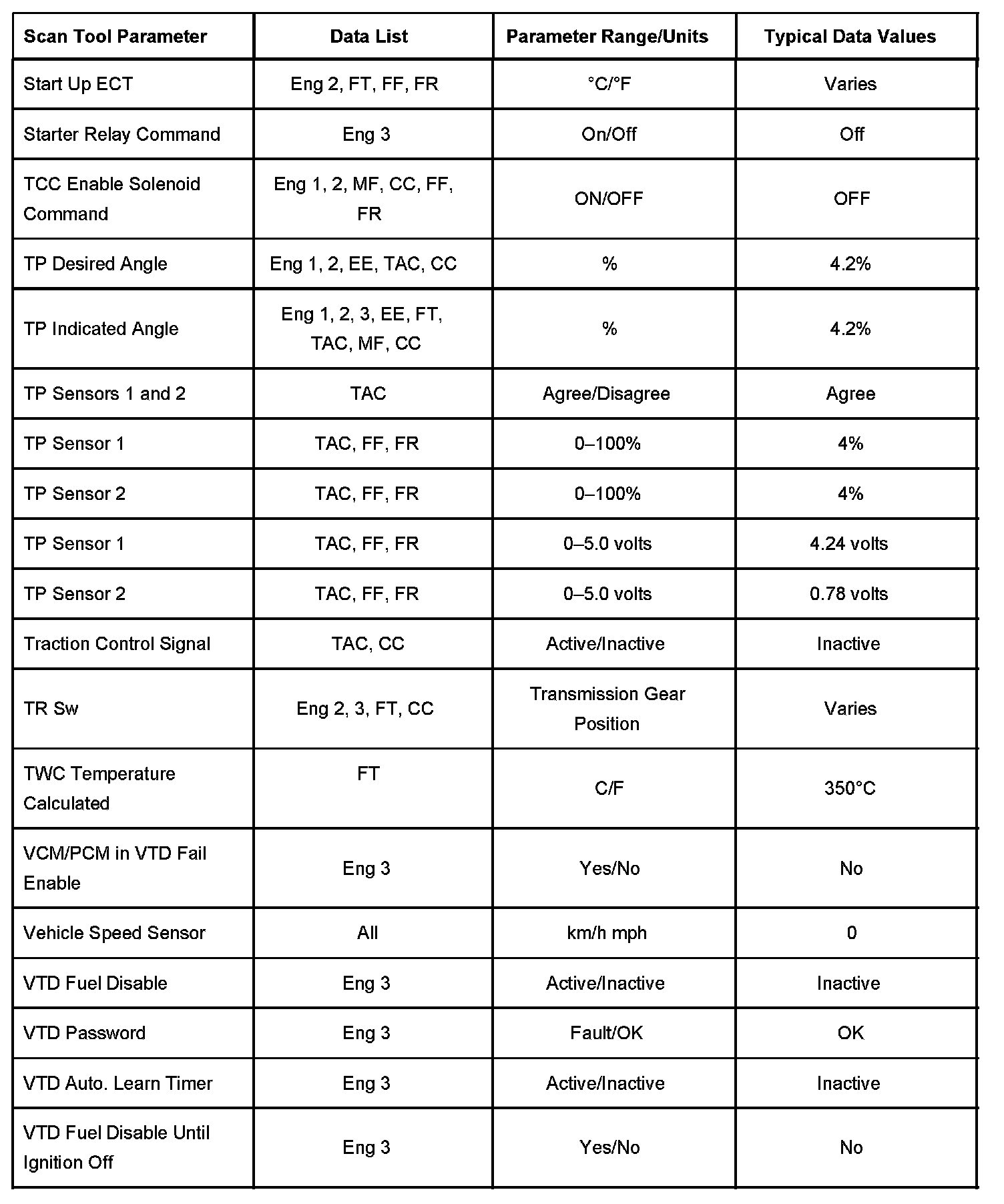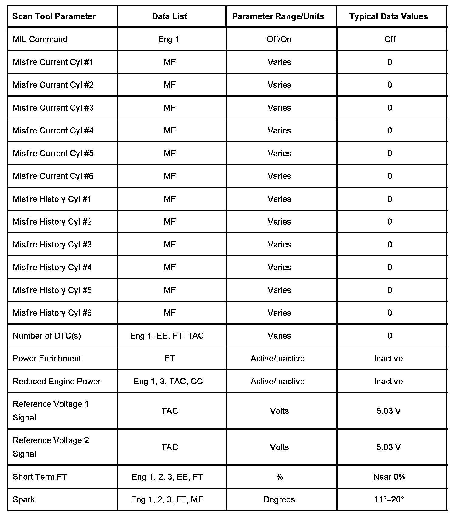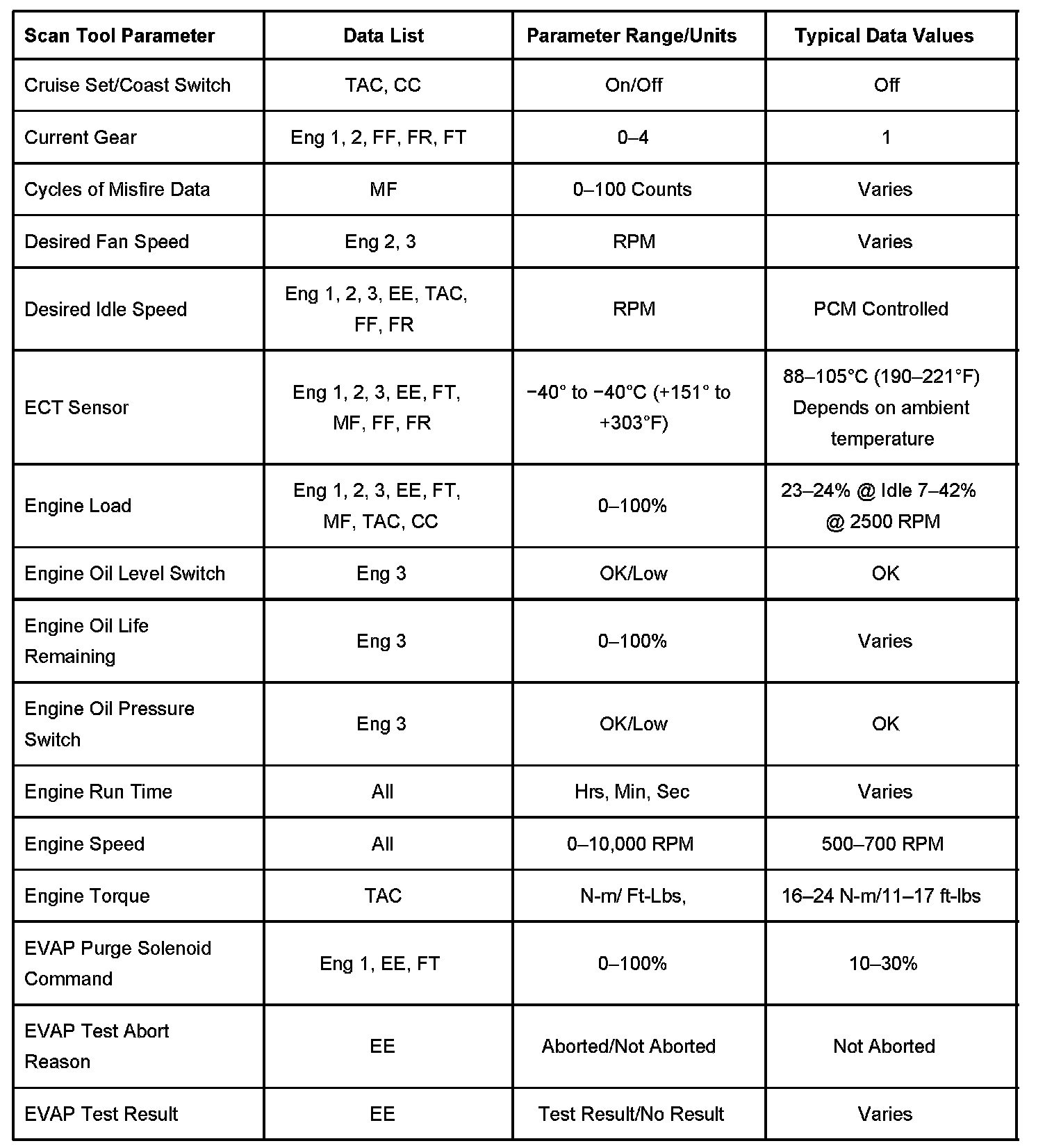 The column labeled Data List indicates where a parameter can be located on the scan tool. Refer to the scan tool operating manual for the exact locations of the data lists. The following is a description of each term listed: