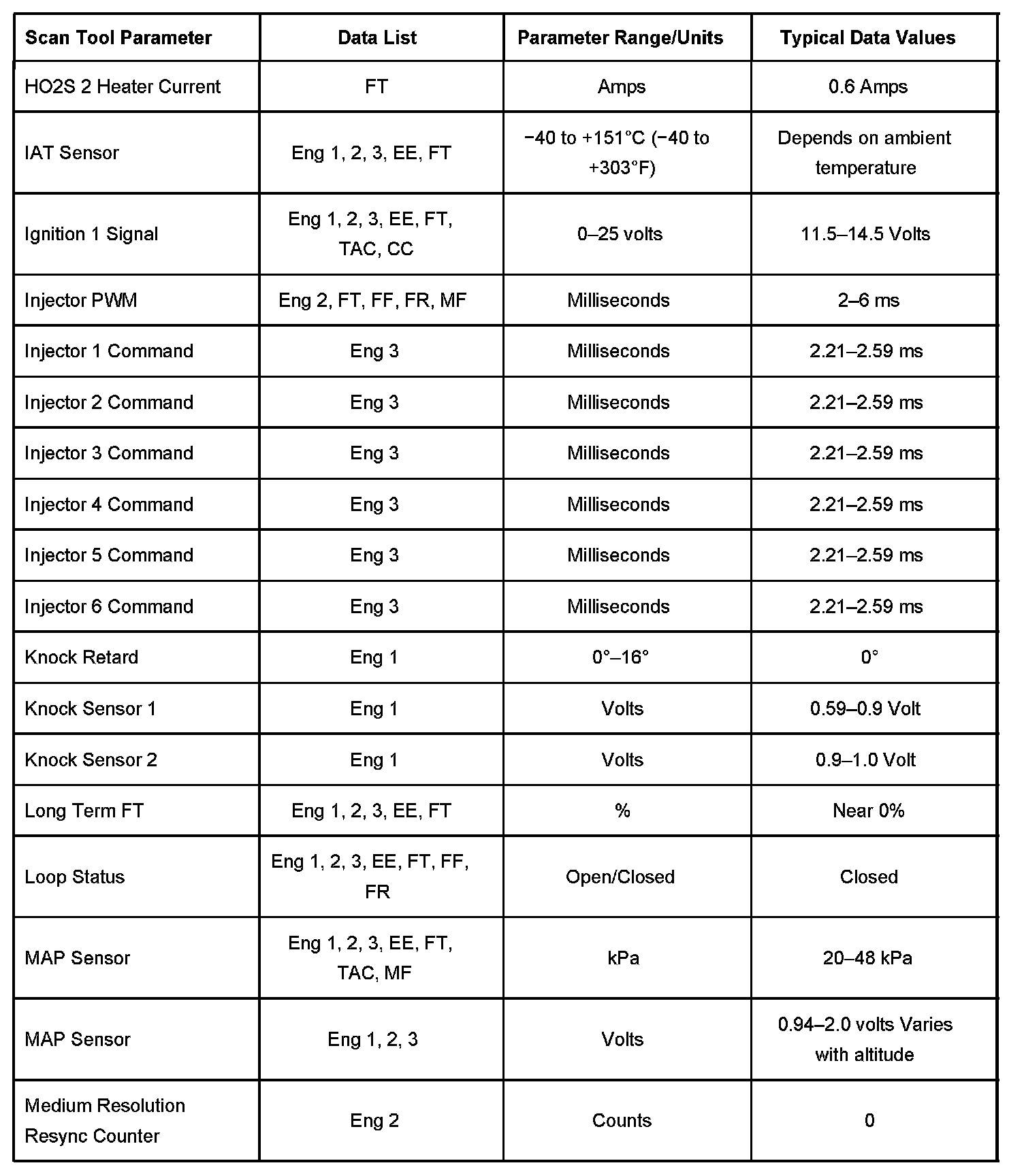 Scan tool values from a properly running engine may be used for comparison with the engine you are diagnosing. The Engine Scan Tool Data List represents values that would be seen on a normal running engine.